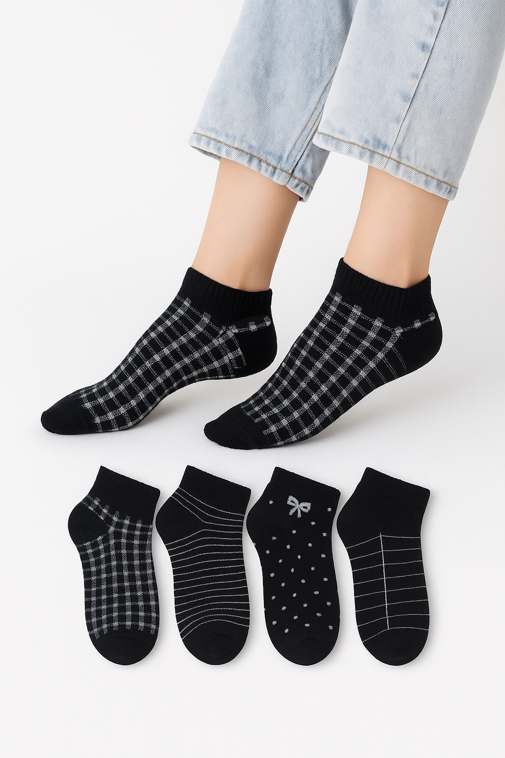 Pamuklu Siyah Dikişsiz Desenli 4'lü Yıkamalı Kadın Çorap
