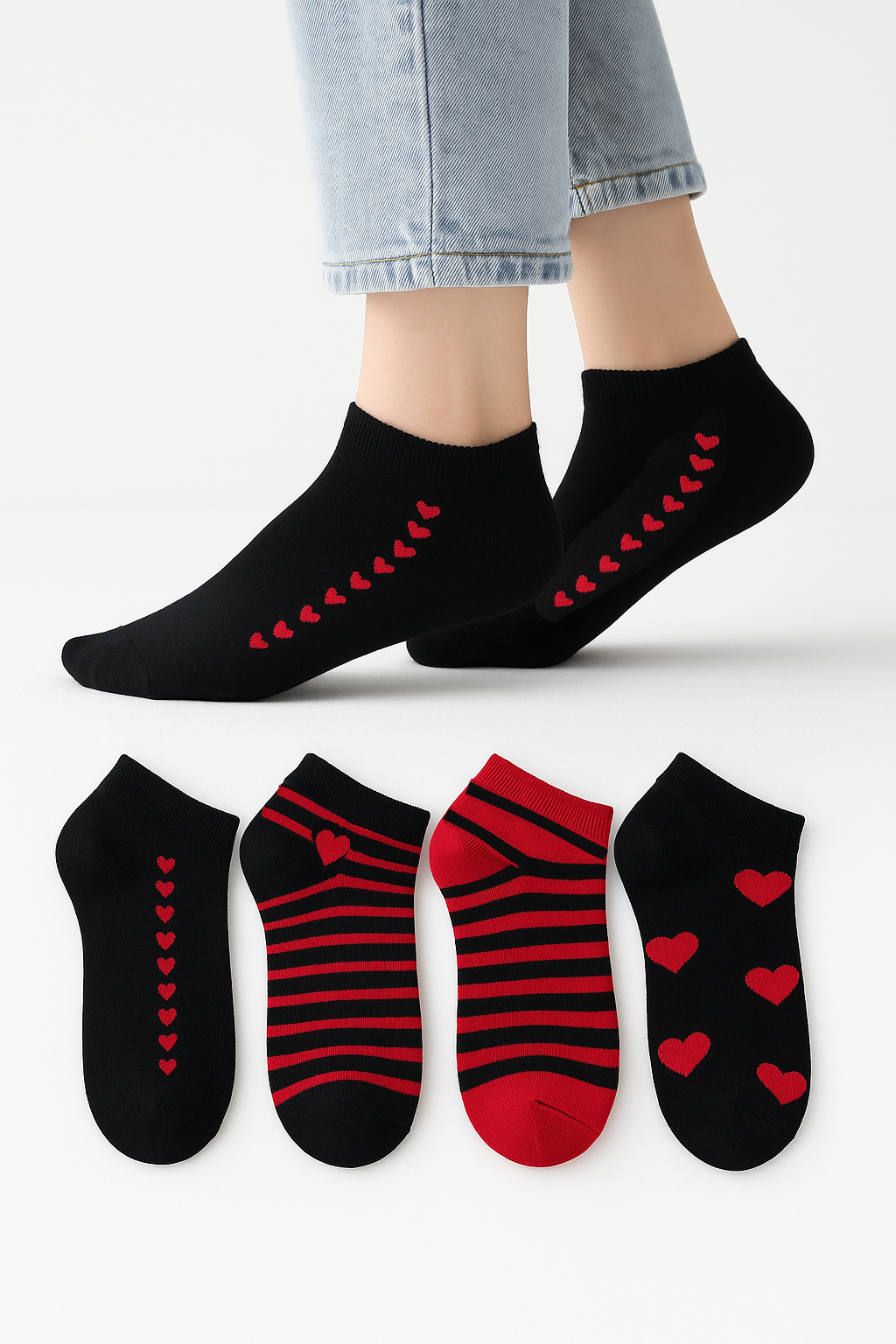 Pamuklu Siyah Dikişsiz 4'lü Desenli Kadın Çorap