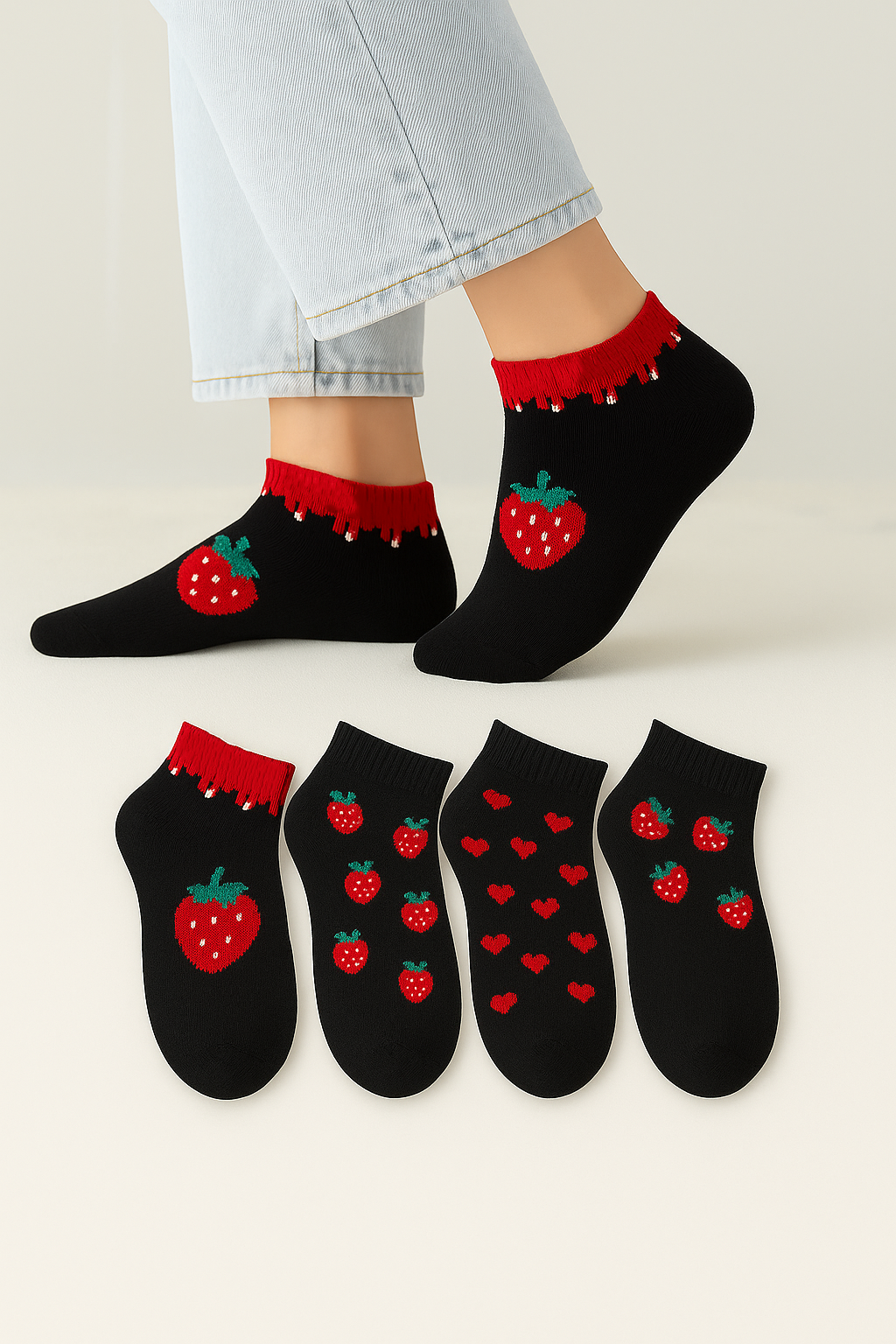 Pamuklu Siyah Dikişsiz 4'lü Çilek Desenli Kadın Çorap
